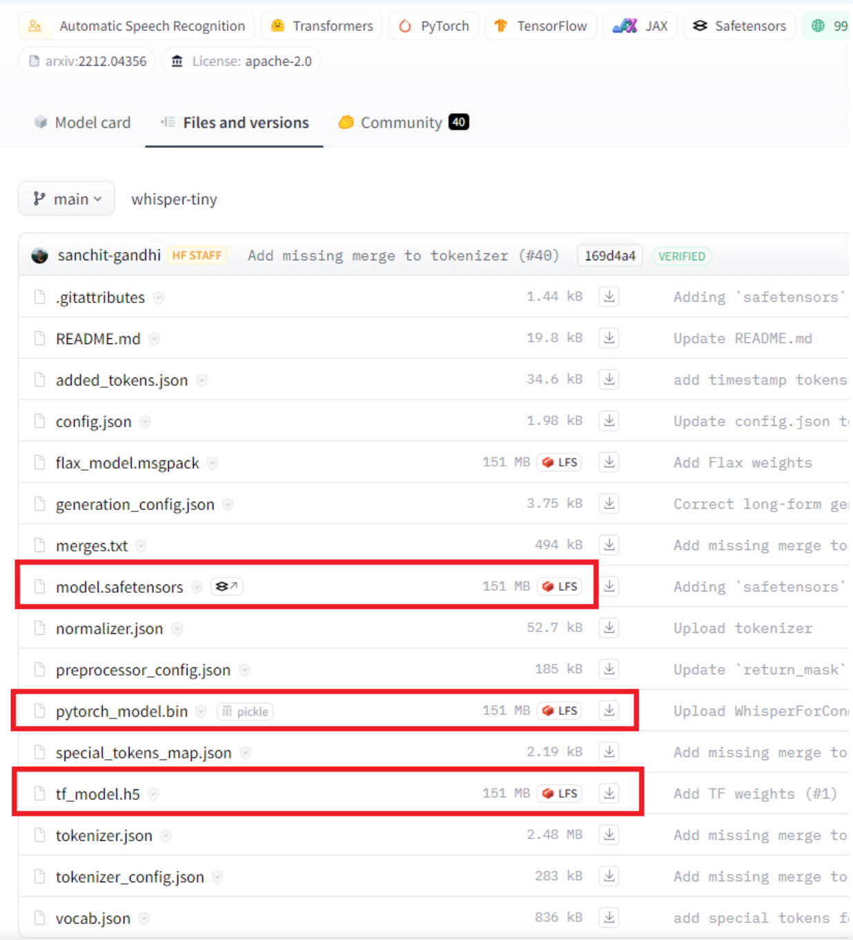 Open-source machine learning frameworks will have different preferred model file formats. Just as you might exercise caution when evaluating external files (such as when processing images), you should be conscious of the underlying file format of the model that is in use. You might see this referred to as the “model weights” or a “serialized model file,” for example. Here are the files that are provided with the “Whisper Tiny” model from OpenAI: